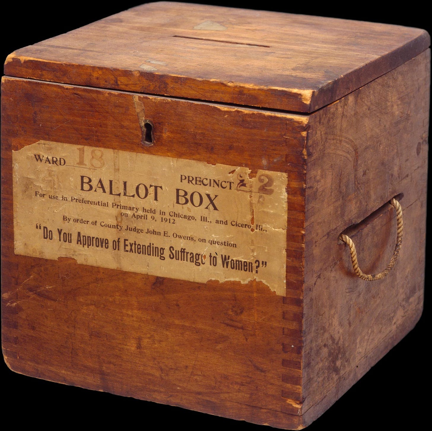 Image: 1912 Chicago ballot box. Source: Clio https://votesforwomen.cliohistory.org/19objects/1912-ballot-box-chicago