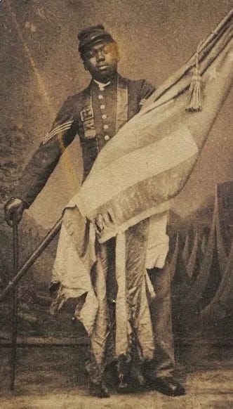 Image:Sgt William Carney holding the American Flag, ca. 1894. Photograph by John Ritchie, Carte-de-vista album of the 54th Massachusetts Infantry Regiment, 1864, album, National Museum of African American History and Culture. NPS https://www.nps.gov/articles/william-h-carney.htm