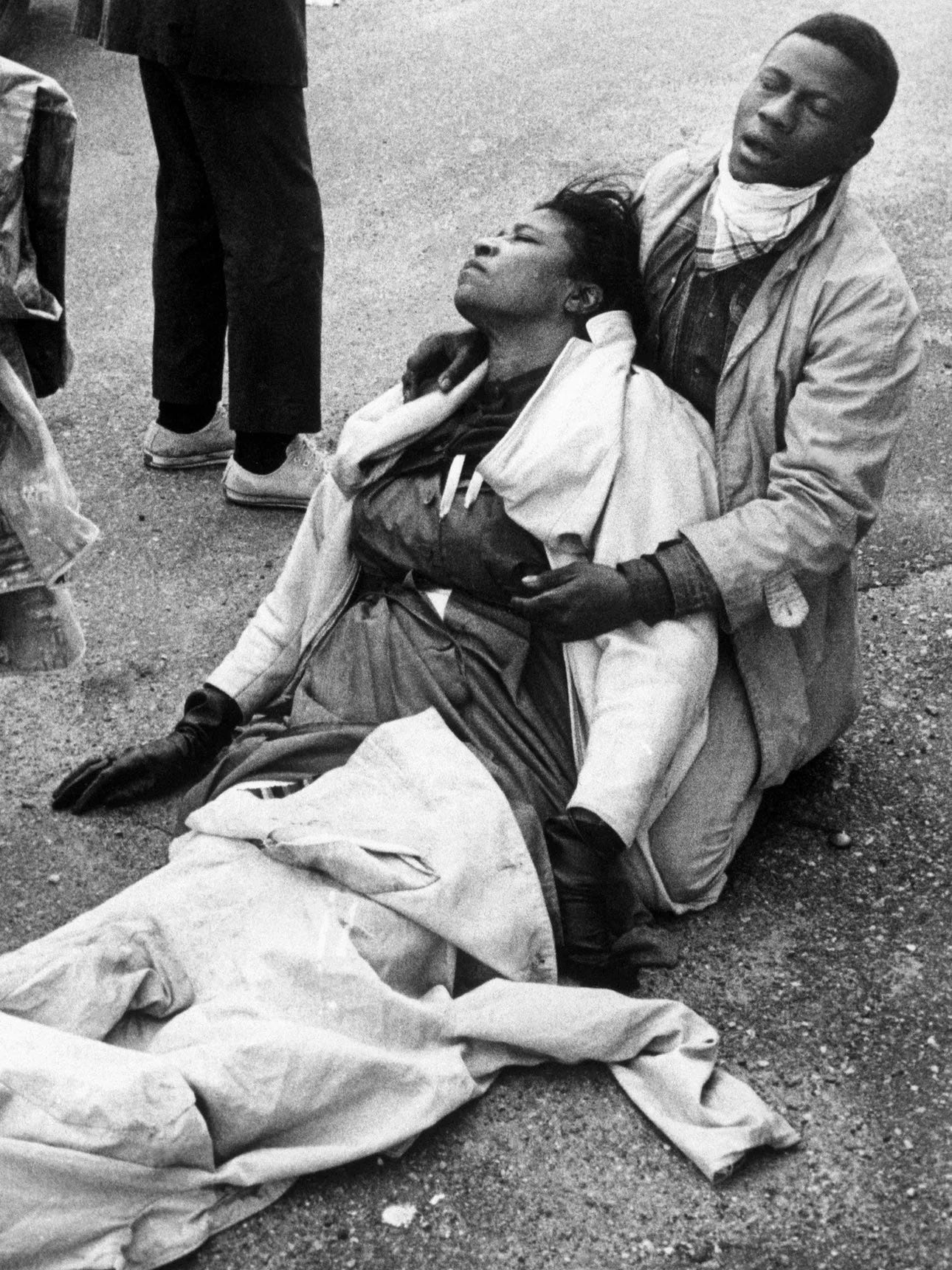 Image: Joe Jones, a civil rights marcher suffering from exposure to tear gas holds an unconscious Amelia Boynton Robinson after mounted police officers attacked marchers on March 7, 1965, in Selma, Ala., as they were beginning a 50-mile march to Montgomery to protest race discrimination in voter registration. https://snccdigital.org/people/amelia-boynton/