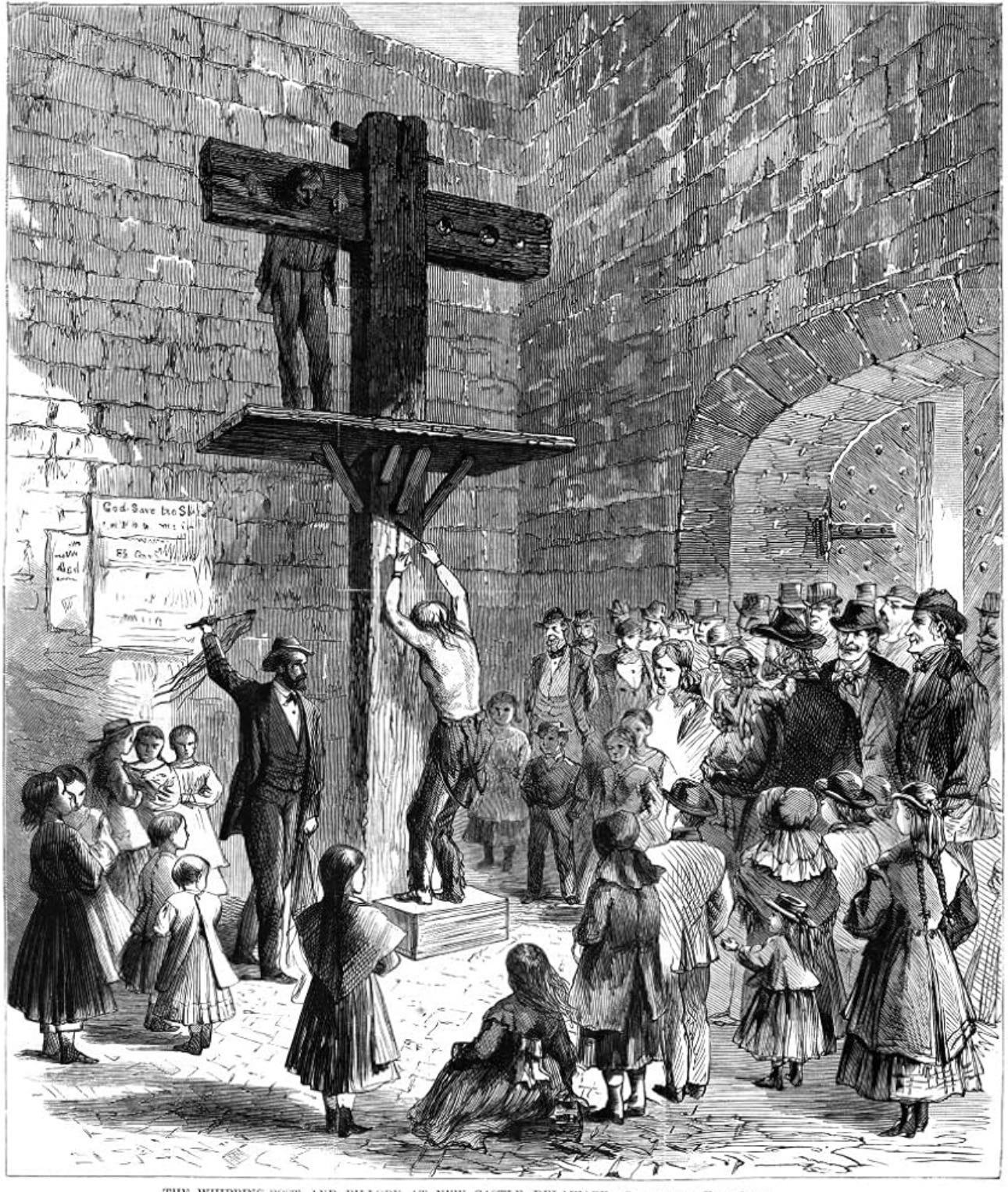 Image: Public Whipping, 1868. The public whipping post and pillory at New Castle, Delaware, 1868, one of the last states to continue the practice of public punishment. Contemporary American wood engraving after a drawing by Earl Shinn. Granger Collection.