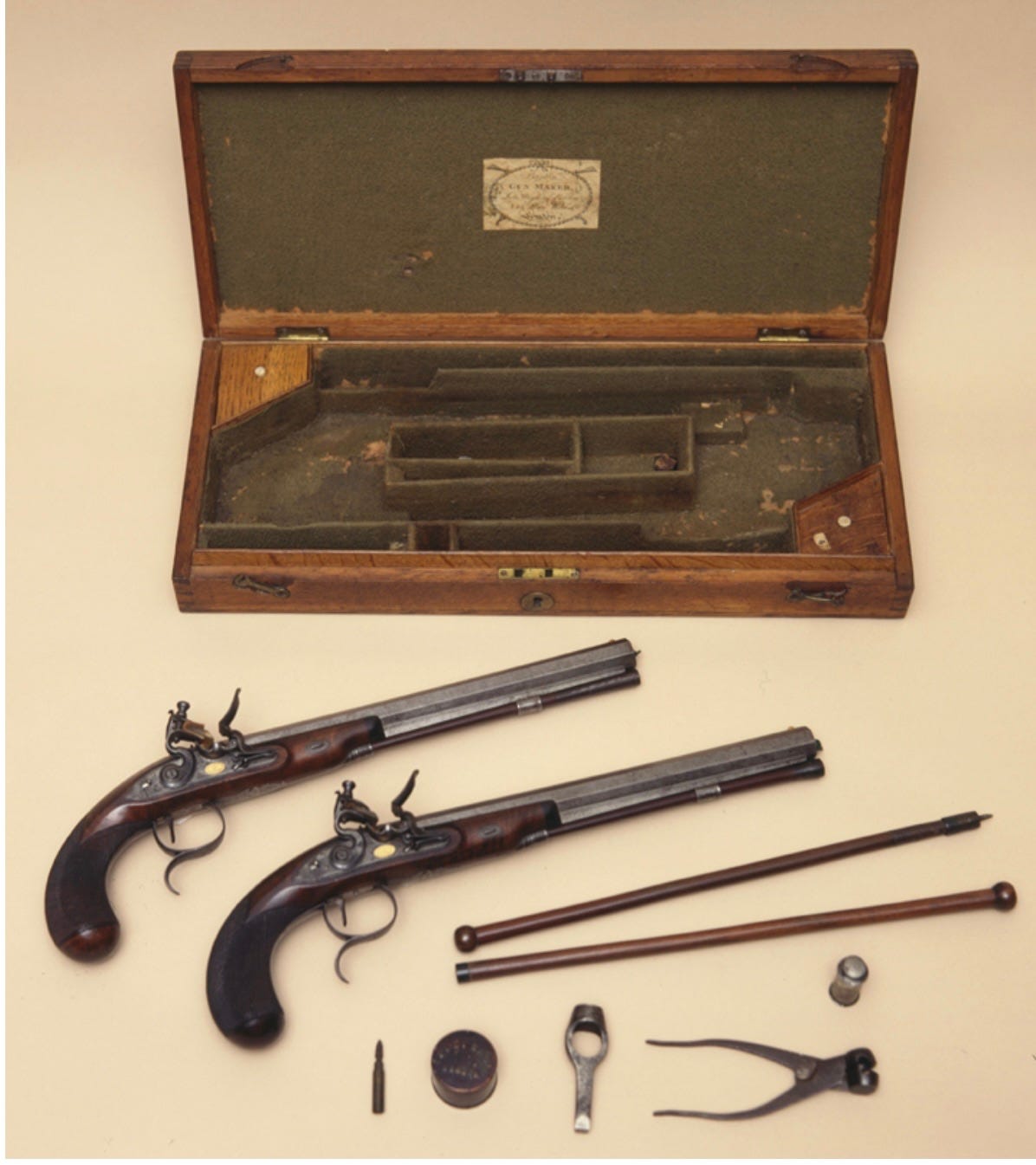 Image: Matched pair of dueling pistols, originally owned by John Randolph (1773-1833). Purchased in London and given to Randolph by Joseph Bryan (1773-1812), this set of pistols was manufactured by Wogdon and Barton. According to a brief article in the Virginia Historical Society Occasional Bulletin (Number 5 [October 1962], p. 8-11), Randolph carried these pistols to his duel with Henry Clay, but other weapons were used. (VMHC 1961.35.A-K).