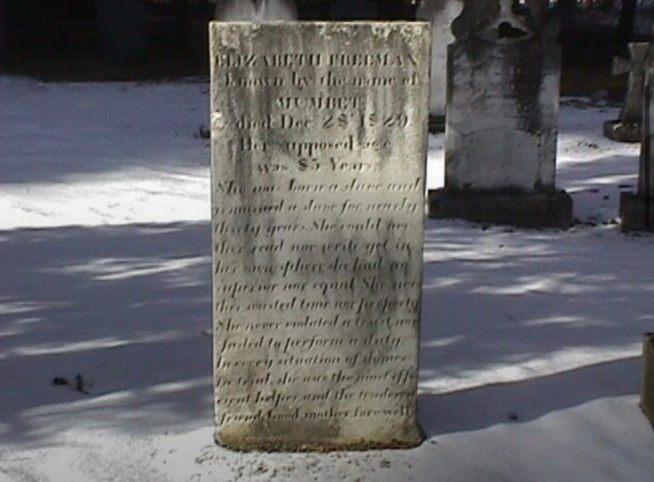 “ELIZABETH FREEMAN, also known by the name of MUMBET died Dec. 28th 1829. Her supposed age was 85 Years. She was born a slave and remained a slave for nearly thirty years; She could neither read nor write, yet in her own sphere she had no superior or equal. She neither wasted time nor property. She never violated a trust, nor failed to perform a duty. In every situation of domestic trial, she was the most efficient helper and the tenderest friend. Good mother, farewell.”