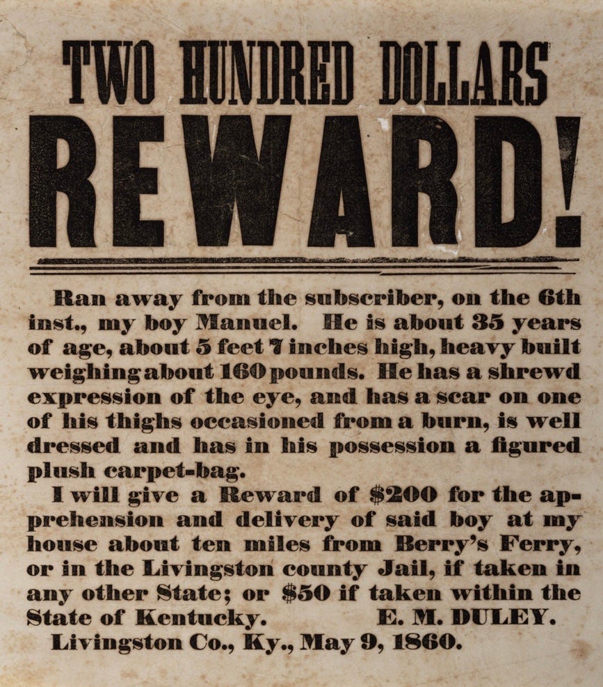 Duley, E. M. Two Hundred Dollars Reward. Broadside announcing the pursuit of Manuel. Livingston County, KY, May 9, 1860.