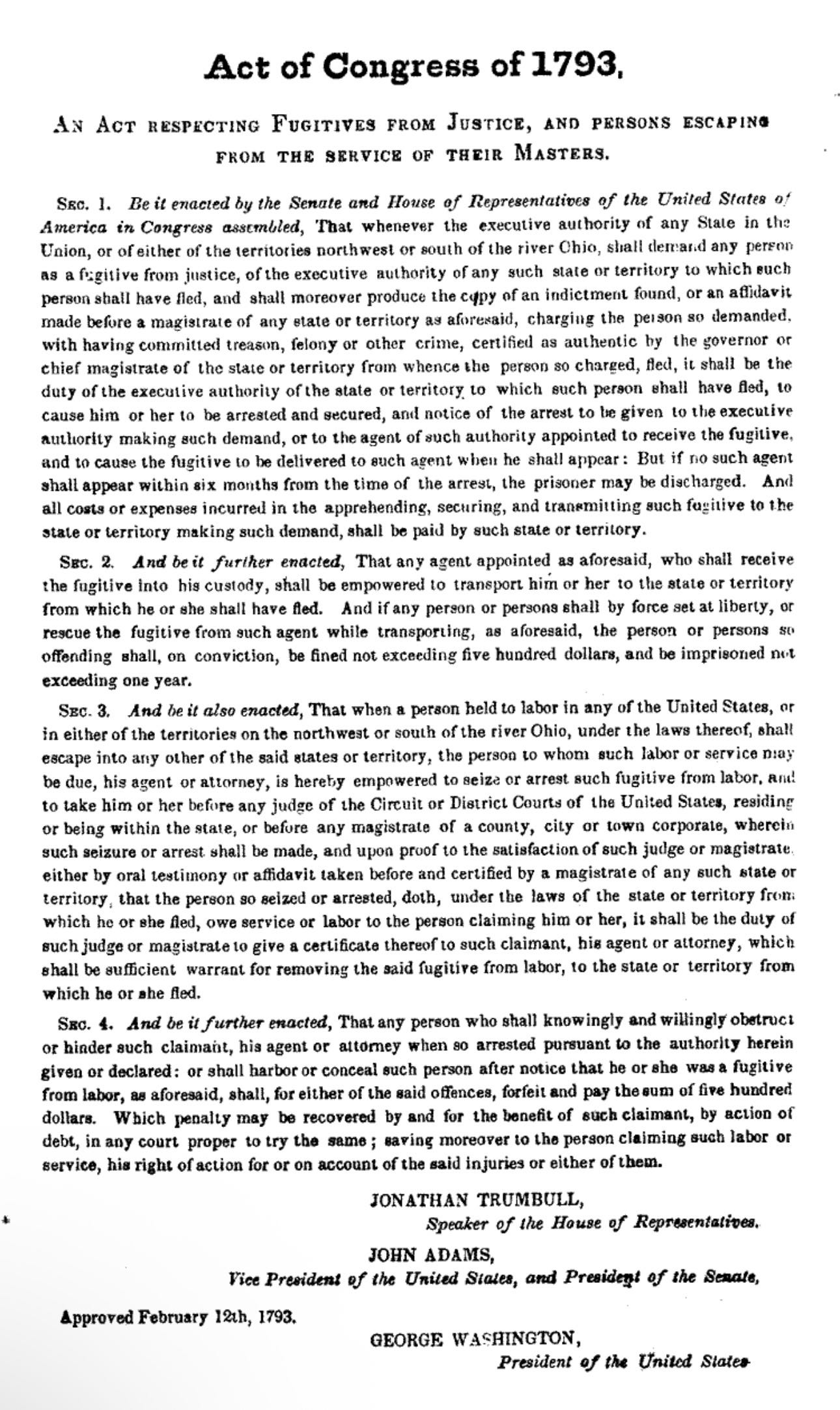 United States Congress. An Act Respecting Fugitives from Justice, and Persons Escaping from the Service of Their Masters. 2nd Cong., 2nd sess. February 12, 1793.